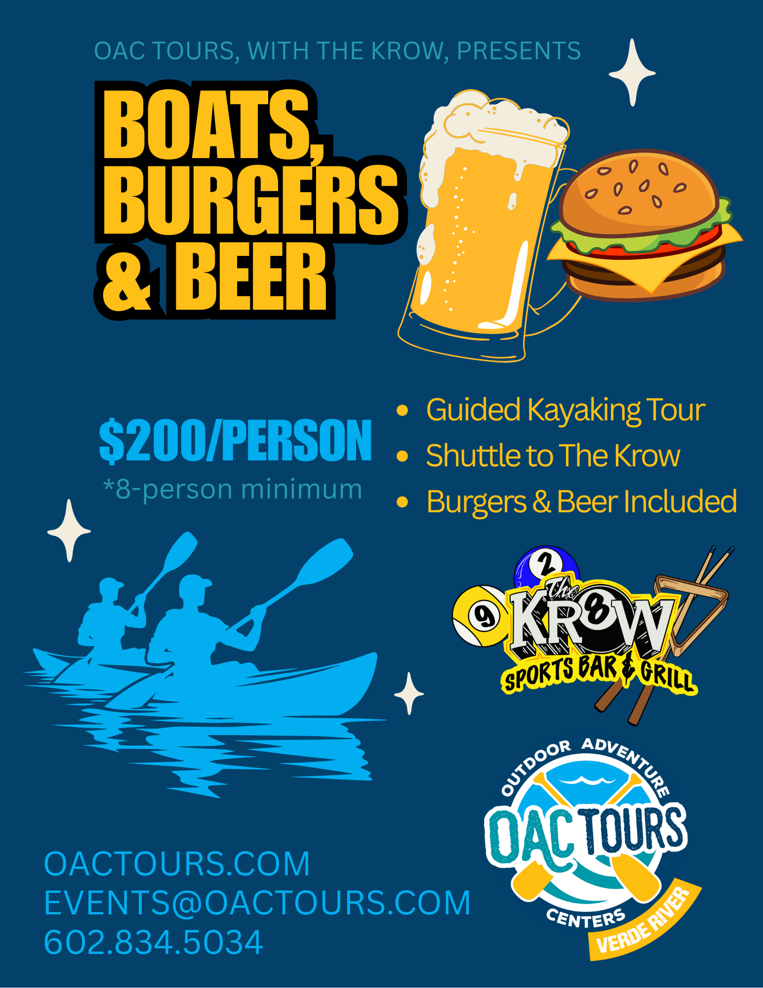 Take a shuttle to the river, join certified guides for a scenic and adventurous paddle down the Verde River and finish off with drinks and eats at The Krow Sports Bar and Grill, a local favorite!